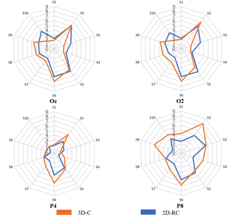 From the evaluation of Figure 12, the average P300 latency of the 3D-C paradigm is lower than the average P300 latency of the 2D-RC paradigm in all channels except the occipital region channels, namely O1, Oz, and O2. The most significant difference between both paradigms' P300 latency is obtained on the P3 channel with 16ms.
