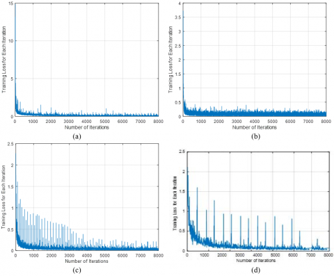 Figure 7. Total loss while training the network: (a) AlexNet; (b) Resnet 101; (c) Resnet-50; (d) YOLO