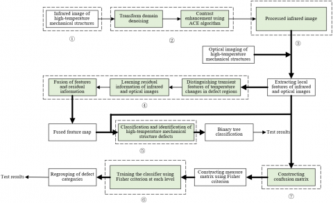 Although high-temperature infrared image processing method has made significant progress in detecting mechanical structure defects, it still has some shortcomings. Infrared images in high-temperature environment may be affected by various interference factors, such as ambient light, smoke, and dust, resulting in low signal-to-noise ratio and affecting the accuracy of defect detection. Defect features in high-temperature infrared images may not be obvious and are mixed with background information, making it difficult to accurately identify and extract them. To overcome these shortcomings, advanced image processing technologies need to be introduced to improve the identification and extraction capability of defect features, such as deep learning and computer vision. At the same time, algorithm design needs to be optimized to reduce computational complexity and improve real-time performance. Therefore, this research studied the detection method of mechanical structure defects after high temperature based on image processing. First, transform domain denoising method was used to decompose the transform domains of images, and to distinguish signals and noises in the images in Chapter 2. ACE algorithm was used to enhance the images. Then a feature fusion imaging detection framework for infrared and optical imaging of high-temperature mechanical structures was constructed in Chapter 3, which improved the accuracy and reliability of defect detection. Deep neural network was combined with the heuristic fusion section, which further explored deep features in the images and improved the fusion effects. In addition, the proposed fusion features were processed using binary tree classification and hierarchical classifier in Chapter 4, which accurately identified the abnormal defect regions in the infrared images. Finally, the experimental results verified that the proposed method was effective.