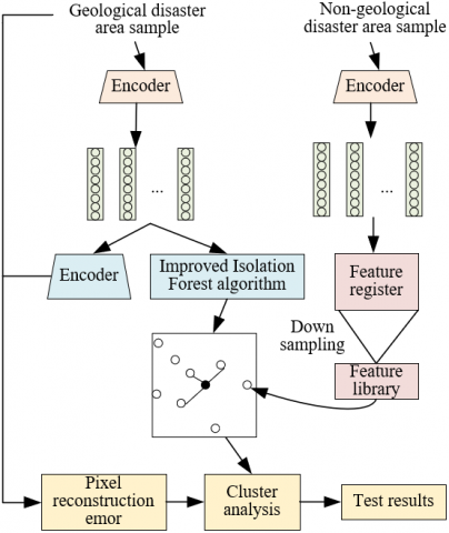 In the original Isolation Forest algorithm, the "path length" index primarily assesses global anomalies and falls short in detecting performance for local anomaly pixels. By replacing "path length" with "local relative quality", sensitivity towards local anomaly pixels is improved. The original Isolation Forest algorithm's detection performance is insufficient when dealing with local anomalies, with problems of false alarms and missed detections. The proposed improvement is expected to resolve these issues and enhance monitoring accuracy. The introduction of the concept of "local relative quality" allows the original algorithm to more accurately detect local anomaly pixels, thereby improving the accuracy of geological disaster monitoring while retaining the advantages of the original algorithm, such as linear computational complexity, unsupervised and non-parametric learning. Figure 3 shows the process of geological disaster monitoring by the proposed method.