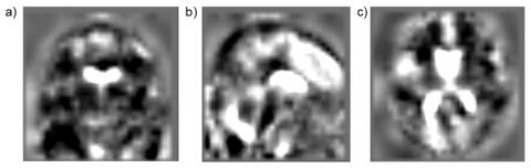 Figure 4. TBM image of the subject: a) Coronal slice; b) Sagittal slice; c) Axial slice