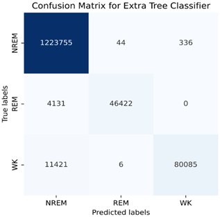 Appropriate machine learning classifiers should be used with appropriate hyper-parameters so that sleep stage classes can be predicted with the highest accuracy. In this study, first, various classifiers were tested with default parameters. As a result of these tests, the accuracy values, training, and test times obtained for each classifier were as shown in Figure 4. Accordingly, the classifiers with the highest accuracy were Extra Tree, Random Forest, and Decision Tree. In terms of training and testing time, Extra Tree and Random Forest need more time. For this reason, it has been seen that the most balanced classifier between Accuracy and training and test times is Decision Tree. However, the tests were repeated in all patients for the 3 most successful classifiers and comparative results are shown in section.