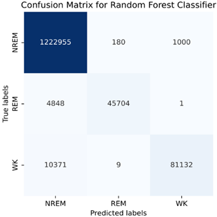 It could be useful to explain feature numeric equalization, score conversion, combining features and feature selection for fully understanding the method. First, Feature Numeric Equalization: A significant challenge was encountered in the dataset because of the different sampling frequencies of the sensors, which resulted in different sample sizes for each channel. A numerical equalization step was introduced to maintain uniformity and compatibility. In this step, the sample size across three groups (1Hz, 100Hz, and 200Hz) was normalized. For the 1Hz and 100Hz groups, the samples were increased by coefficients of 200 and 2, respectively. This approach allowed a consistent sample size to be maintained across all channels, a factor that was critical for feeding the data into the machine-learning model. Secondly, Score Conversion: After the data were pre-processed and transformed, sleep stage scores were assigned based on American Academy of Sleep Medicine (AASM) standards. The dataset was labelled by well-trained sleep specialists according to these standards, with each 30-second epoch classified as N1, N2, N3, REM, or WAKE. However, to simplify the model, the N1, N2, and N3 stages were combined under the umbrella term ‘NREM’. Thus, the scoring classification included three categories: NREM, REM, and WAKE. Thirdly, Combining Features: In the feature combination stage, the 16-channel data for each epoch were merged, resulting in each epoch containing a 16-dimensional feature vector. Each feature represented data from a different channel, and each channel provided unique information relevant to sleep-stage classification. Finally, Feature Selection: The original data were collected from 27 channels of the PSG device. An initial focus was placed on 19 of these channels, which were commonly available in every dataset. However, through preliminary testing with five different classifiers, it was found that data from three of these channels (CFlow, LEG1, and LEG2) had minimal impact on the classification results. As a result, 16 channels from the initial 19 were selected for the final model to optimize computational efficiency and model performance.