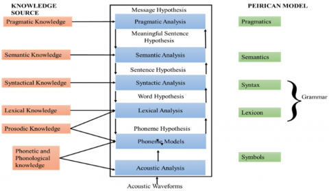 The model contains four constructs. These constructs are symbolics, grammatical, semantic, and pragmatics. All these constructs also have prominence in speech recognition. The symbols may be any speech unit such as word, phoneme, and syllable.