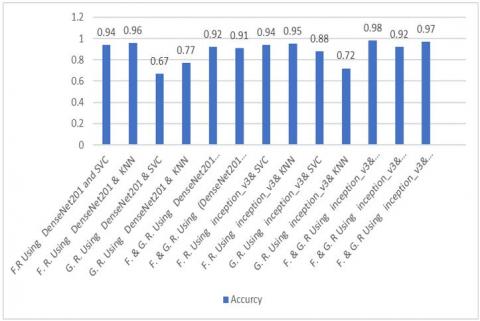 n this study, the final comparative accuracy measure was adopted between facial recognition and gait separately, and the combination between them on two levels (features, score). As shown in Figure 11, merging the face and the gait using the inception_v3 algorithm to extract features with the SVM as a classifier achieved the best performance with an accuracy of 0.98. While fusion on score level using decision trees achieved 0.97. The results of separate face and gait recognition using the same algorithms for feature extraction and classification are 0.94 and 0.82, respectively.
