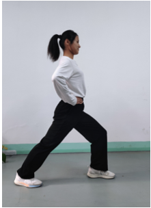 Make one leg back swing from the toe to the forefoot, without landing the heel, keep the toe towards the front. Leans slightly forward, stand waist and tuck the abdomen.