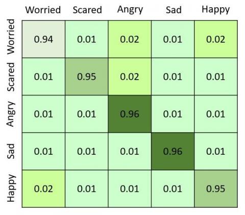 In Figure 10, the confusion matrix is given for the classification of emotional classes, and the corresponding confusion graph is in Figure 11. The Classes ‘Angry’ and ‘Sad’ are identified with the highest value of 0.96.