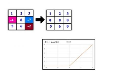 Convolutional filters are applied to the image horizontally as well as vertically in the layer known as convolutional, which calculates the dot product by including the bias term. The operation of the convolution layer is shown in Figure 5. Edge detection, picture blurring, image sharpening, and other processes employ convolved images. The ReLu layer is utilised for non-rectilinear function and to prevent negative values. The ReLu layer's operational mode is shown in Figure 6. The ReLu level output purpose could be explained as follows: