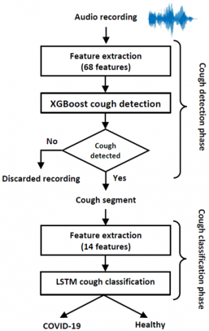 (3) To classify the detected cough segments extracted from the acquired audio recordings into COVID-19+ and COVID-19-, the LSTM neural network, capable of modeling time series variations, is employed along with MFCC features and log energy.