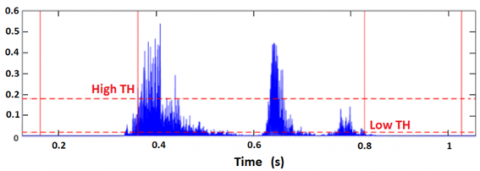 The onset cough instant is detected when the signal power is above the high threshold, while its end is determined by the signal power falling below the lower threshold for a continuous duration of 0.01 second, ensuring the accurate detection of the end of the cough signal. Note that cough sounds lasting less than 0.2 second are discarded. However, to guarantee that the detected cough is not cut short, the algorithm considers a duration of 0.2 second before and after the signal as a part of the cough. Figure 3 depicts the process of detecting the onset and end times of the cough segment.