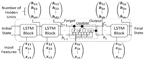 The first LSTM block computes the first output and the updated cell state using the network initial state and the first-time step of the sequence. Then, the block computes the output and the updated cell state $C_t$ at time step $t$ using previous state of the network ($C_{t-1}, h_{t-1}$) and the next time step of the sequence.