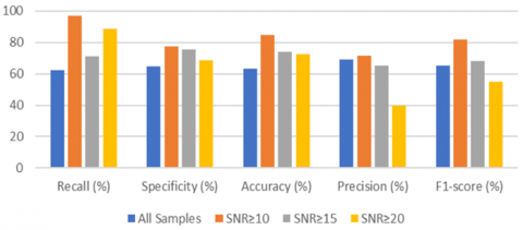 Table 6 and Figure 7 report the results for males in the COUGHVID dataset where the best results were achieved for SNR ≥10dB with F1-score=82% and a sensitivity of about 97%. For the cases of SNR ≥15dB where there is not enough number of samples to train the model properly, the classification system performs poorly with relatively low values of sensitivity and F1-score.