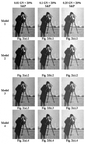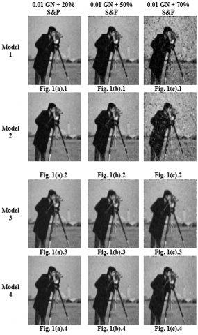 Figure 2. Simulation results of Model 1 to Model 4 at 20% salt and pepper and Gaussian noise of variance 0.01, 0.1 and 0.25