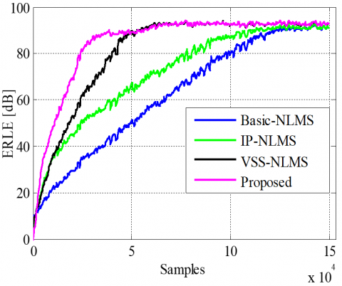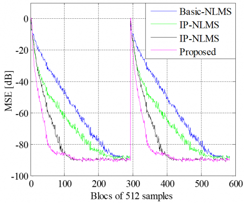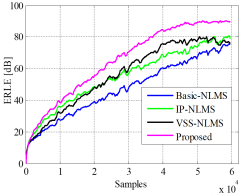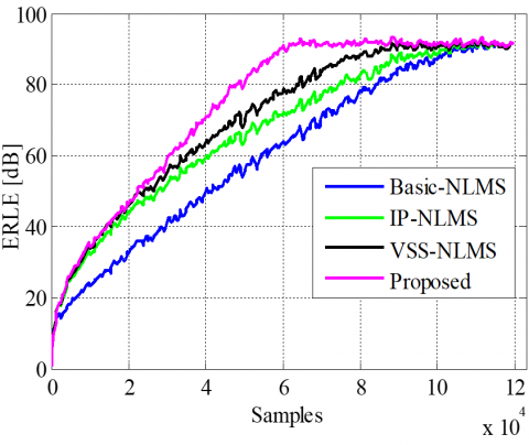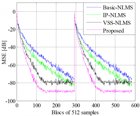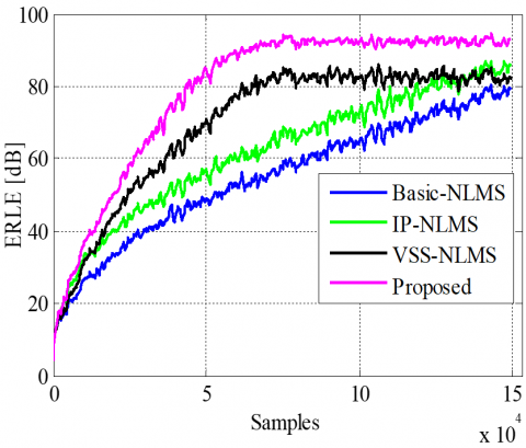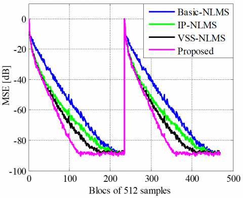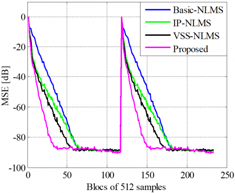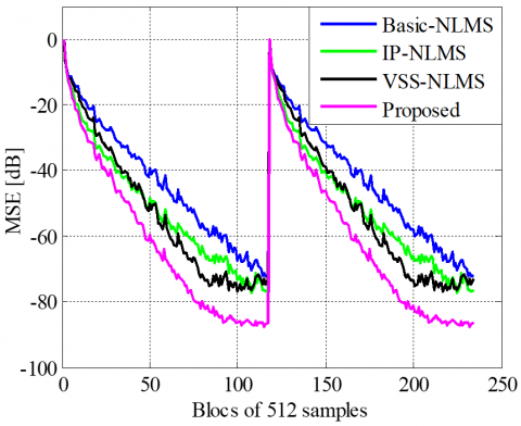 According to Eq. (8), we note that the resulting error $e(n)$ is used to approximate the near-end speaker $s_a(n)$. This result is obtained after convergence of optimal coefficients $w_{a, o p t}(n)$ to the coefficients of the real impulse response $h_a(n)$. The LMS algorithm is the most commonly used due to its simplicity of implementation, its reduced complexity and its numerical stability, but this latter has some drawbacks such as: its poor performances against long and time varying echo paths; its very sensitivity against non-stationarity input signals.