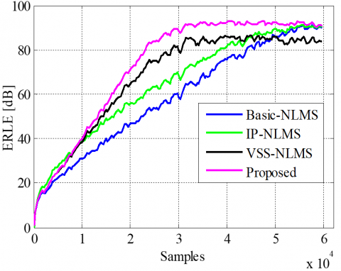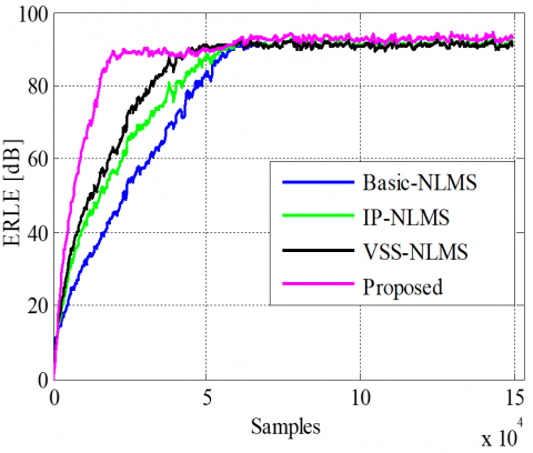 where, $\xi_{I P}=((1-\alpha) / 2 M) \xi_{n l m s}$ and $\alpha$ is a control parameter must be fixed between -1 and 1. Exactly at the initial convergence of adapting filter, we use the small number that introduced to prevent numerator from the division by zero. The IP-NLMS algorithm becomes identical to the basic NLMS when $\alpha=-1$, also, if this scalar equals to 1 , the two algorithms IP-NLMS and P-NLMS become similar. In AEC applications, the suitable choices of $\alpha$ are $\alpha=0,-0.5$ or -0.75 [20].