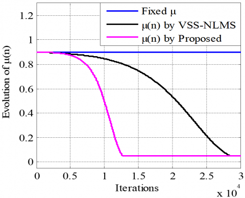 with $0<k<1$. The final variable step-size parameter used in updating equation is controlled and adapted using the next condition to guarantee the convergence of adaptive filters,