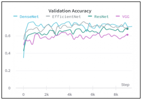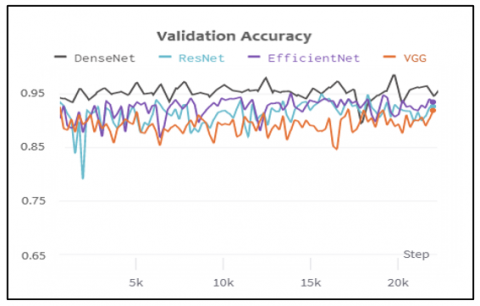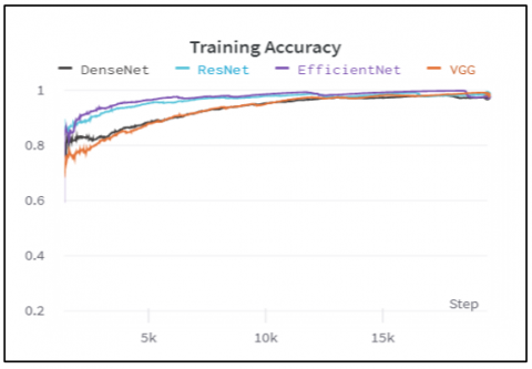 The range of values for training accuracy is 95% to 100% while that of validation accuracy is 60% to 80% as shown in Table 1. This clearly indicates that the model has overfitted the training data. Overfitting is a common problem in machine learning where a model learns to fit the training data too closely, resulting in poor generalization performance on new, unseen data. Figure 2 shows that EfficientNet has a faster learning path, followed by DenseNet. Whereas ResNet and VGGNet have relatively slow learning paths. But after 85 epochs, all the models are almost showing the same accuracy.