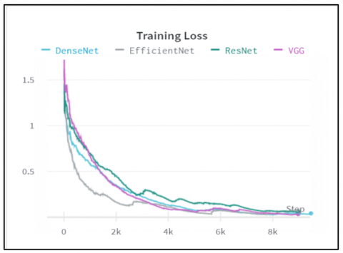 Figure 4 and Figure 5 illustrate the training and validation loss for four different CNN architectures - VGGnet, ResNet, EfficientNet, and DenseNet. The y-axis displays the loss numbers, while the x-axis lists the various models. Each model's training and validation loss values are represented on the graph as a single point.