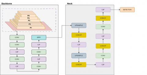 The metrics presented in Table 2 include input size (pixels), mean average precision (mAP), processing speeds (CPU ONNX and A100 TensorRT), number of parameters and number of floating point operations (FLOPs). There are notable differences in performance between the models, with larger models (e.g. YOLOv8x) requiring more computational resources while achieving high accuracy rates. In contrast, more compact models like YOLOv8n are suitable for applications needing speed and efficiency. Figure 4 shows the architecture of the YOLOv8 model.