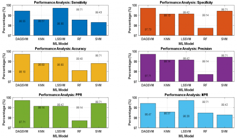 Figures 10 and 11 visually display the assessment of machine learning models using performance metrics such as accuracy, sensitivity, specificity, precision, positive predictive rate (PPR), and negative predictive rate (NPR).