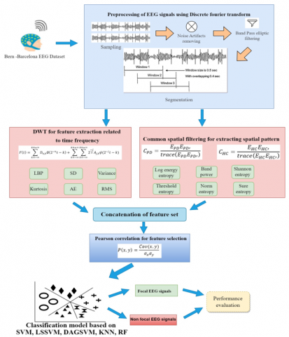 Alturki et al. [15] assessed EEG band power using DWT and SVM algorithms. This method enhances the rate and accuracy of diagnosing brain disorders and suggesting potential medical applications. de Filippis et al. [17] used structural and functional MRI data to study neurological illnesses using machine learning algorithms. Despite the challenges in the practical application of their study, it greatly enhances our understanding of the brain's substrates for these conditions and significantly improves diagnostic accuracy. They also offer an automated method to identify focal EEG signals by examining higher-order statistical moments, which can differentiate between focal and non-focal signals. The process involves four steps: preparation, feature extraction, processing, and analysis of the results.