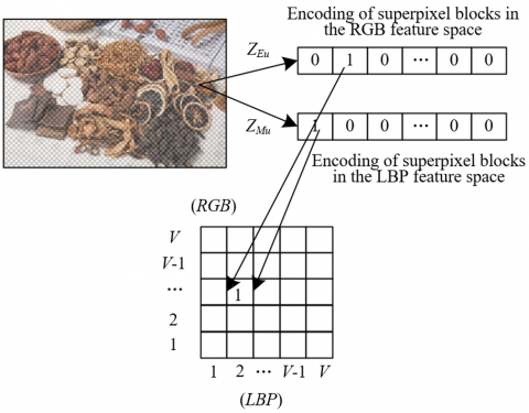 Furthermore, image encoding was performed in this study. The fundamental principle behind this process is the feature extraction from TCM material images, followed by clustering and encoding techniques in the RGB and LBP feature spaces, which generate a high-dimensional vector that describes the color and texture features of each TCM material image. Initially, superpixel block features were extracted from the image in the RGB and LBP feature spaces. Then, clustering algorithms such as K-means or FCM were applied to generate two codebooks, which represent the visual dictionaries in the color and texture spaces of the image. For each superpixel block, quantization encoding methods were employed in both feature spaces, mapping it to the corresponding codebook. This results in two independent encodings. The position of each superpixel block in the codebook was determined by calculating the Euclidean distance between the superpixel block and its associated cluster center, followed by updating the corresponding statistical values. This process eventually generated an encoding vector that reflects the overall distribution of the image. The encoding is represented by a statistical histogram, i.e., a V×V matrix, where the elements in the matrix indicate the distribution of the image across different cluster centers. Let the encoding value of a superpixel block at the corresponding position in the V×V codebook be denoted as zuk. The encoding values of the superpixel block in the RGB and LBP codebooks at their respective positions are denoted as ZEu and ZMk, respectively. For each superpixel block, the encoding is represented as: