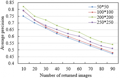 According to the data shown in Figure 5, the size of the codebook significantly affects the average precision of TCM material images. For images with a size of 50×50, as the number of returned images increased, the precision gradually decreased from 0.75 to 0.47. For 100×100 images, the precision decreased from 0.79 to 0.48. In the case of 200×200 images, the precision reached its highest value of 0.82 when the number of returned images was 10, and it gradually declined as the number of returned images increased, reaching a minimum value of 0.54. For images of size 250×250, the initial precision was 0.79, but as the number of returned images increased, the precision dropped to 0.51. Overall, as the image size increased, the average precision improved, but in the case of increasing numbers of returned images, the precision generally showed a downward trend. This decline was particularly noticeable for smaller image sizes (e.g., 50×50), where the precision decreased more significantly with an increase in the number of returned images.