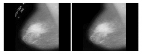 Histogram equalization (HE) is a prevalent method for improving picture contrast, often used in image processing, including mammograms. It adjusts the intensity levels of the picture to cover the whole dynamic range, improving contrast and making the image more visually attractive and simpler to analyze [15]. Figure 4 displays the original picture beside the image with contrast enhancement achieved using histogram equalization.