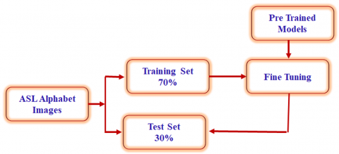 This step's objective is to resize the hand region to the pretrained CNN input image size by segmenting it within the hand gesture image frame. The Kinect depth camera provides color and depth map images, as seen in Figure 5. For static hand gesture recognition, only images from the depth map are taken into account between two inputs. The hand region in the depth map is divided using the depth threshold. As seen in Figure 5, the depth threshold to separate the hand from the background is set at the experimentally determined value of 10cm [14]. The hand region is located and the noisy portion of the hand is eliminated using a maximum area based filtering technique. The segmented image as displayed in Figure 5's bounding box model. The bounding box region is then cropped from the image that has been segmented. Three-channel input images are used by every pretrained CNN to function.