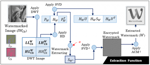 (2) Improved Secret Data Embedding: WH-SVD-Cb enhances imperceptibility by incrusting the secret data in the Cb component of the YCbCr space using transformation and encryption techniques. The integration of HD, SVD, and Arnold's Chaotic Map within the DWT domain boosts robustness and security. This study delves into the YCbCr color space, introducing watermark into Cb component to achieve the desired outcomes.