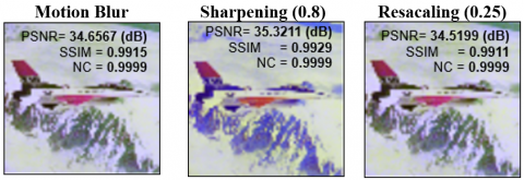 Gaussian noise and sharpening attacks were explored in Figures 13(e) and 13(f), with varying variance and threshold settings. The results indicated that NCs for both Gaussian noise and sharpening were effectively equal to 1. Compared to other schemes such as Y [37], YCbCr [38], and YCb, the proposed method clearly outperforms the others.