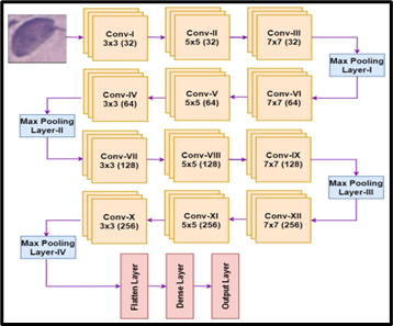 where, the probability for the jth class is pj and truth label is tj. The proposed PSIC system uses batch normalization to normalize the inputs and speed the learning process to improve categorization. The batch size that is used in the proposed system is 32. The hidden layers use the rectified linear activation function. Other activation functions, including softmax, sigmoid, and linear, may be utilized at the output layer. The sigmoid function has been chosen for this study since it uses probability distributions when classifying the data. The definition of softmax function for N output layer with the output value of ith layer (Xi) is,