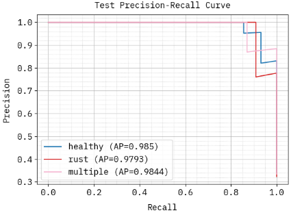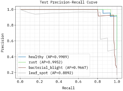 To ensure reliable performance evaluation under class-imbalance conditions, additional diagnostic metrics—sensitivity, specificity, and AUC—were computed alongside precision, recall, and F1 score. Sensitivity quantifies the model’s ability to correctly detect diseased leaves, whereas specificity measures its ability to correctly identify healthy samples. AUC provides a threshold-independent estimate of the system’s discrimination capability. The results for the ISSAE–PPBO model are presented in Table 10.