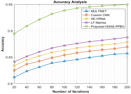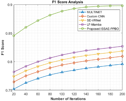 The results show that the ISSAE–PPBO model achieves peak performance at the PPBO-identified hyperparameter settings. Deviations from the optimal sparsity penalty cause either excessive neuron activation (λ too low) or loss of meaningful features (λ too high), both reducing accuracy. Similarly, learning rates smaller than the optimal slow convergence, while higher values destabilize training. The hidden neuron count demonstrates a threshold effect in which both under-parameterization (H = 64) and over-parameterization (H ≥ 256) degrade performance due to insufficient feature representation or overfitting. This analysis confirms that PPBO plays a critical role in selecting balanced hyperparameters that maximize classification accuracy and training stability.