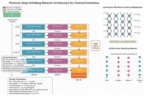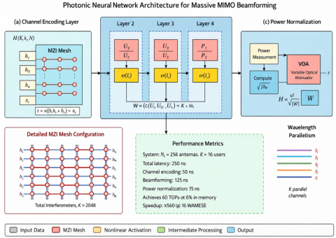 (1) A novel photonic neural network architecture exploiting WDM parallelism for massive MIMO beamforming and channel estimation, with theoretical analysis demonstrating $O(N)$ latency scaling versus $O\left(N^2\right)$ for electronic implementations.
