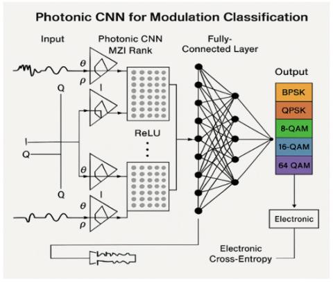 (3) Experimental validation on fabricated silicon photonic integrated circuits demonstrating sub-nanosecond inference latency with 95.3% classification accuracy for 16-QAM modulation recognition and 0.92 normalized mean square error for channel estimation.