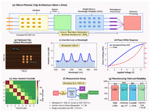 Silicon photonics maturation has catalyzed the practical realization of integrated optical neural networks. CMOS-compatible fabrication enables monolithic integration of thousands of photonic components on chips with footprints below $100 \mathrm{~mm}^2$ [12]. Mach-Zehnder interferometer (MZI) meshes implement arbitrary unitary matrix transformations through cascaded programmable beam splitters, achieving 8-bit equivalent precision for 100 × 100 matrices. Microring resonator arrays enable wavelength-selective operations with quality factors exceeding 10⁶, facilitating ultra-compact filter banks. Silicon-organic hybrid modulators achieve electro-optic bandwidths surpassing 100 GHz with sub-volt drive requirements, providing efficient electronic-optical interfacing [12].