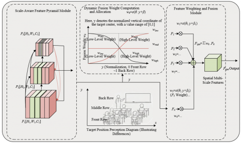 The core goal of the multiscale deformable convolution spatial-domain branch is to solve the problem of unbalanced feature representation for targets of different scales in classroom scenarios. It uses deformable convolution v4 as the basic feature extractor and constructs a scale-aware feature pyramid network. The core innovation lies in introducing a dynamic scale weight allocation mechanism to adaptively enhance features of targets at different scales. The scale-aware feature pyramid network adopts dilated convolutions with differentiated dilation rates. High-level feature maps correspond to small targets in the back rows, using a dense sampling pattern with a dilation rate of 1 to preserve target detail features to the maximum extent. Low-level feature maps correspond to large targets in the front rows, using sparse sampling patterns with dilation rates of 3 or 5 to effectively expand the receptive field and cover global features of the targets, providing a multiscale feature basis for subsequent dynamic weight allocation. Figure 1 shows the structure of the multiscale deformable convolution spatial-domain branch and the dynamic weight allocation schematic.