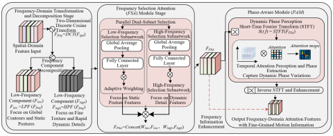 Figure 2 shows the internal workflow of the frequency-domain attention and phase-aware modules. As shown, the phase-enhanced frequency-domain feature Fphase is inversely transformed by 2D-DCT, mapping back to feature space to obtain frequency-domain features rich in fine-grained motion information, serving as the final output of the frequency-domain branch. The innovative advantage of this branch is that it introduces frequency-domain analysis into classroom behavior recognition for the first time. Through the joint design of the frequency-selection attention module and phase-aware module, it achieves synchronous capture of frequency differences and dynamic phase information. Existing attention mechanisms cannot capture frequency characteristic differences of easily confused behaviors, while this branch, through adaptive selection of low- and high-frequency components and enhancement of dynamic phase information, can effectively distinguish behaviors such as reading vs. using a phone and writing vs. resting chin on hand, providing complementary fine-grained feature support to the spatial branch and significantly improving behavior recognition accuracy.