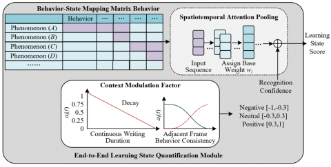 The core goal of the end-to-end learning state quantification module is to solve the problem that existing methods can only achieve behavior classification and cannot transform recognition results into interpretable learning state quantification indicators. Its core innovation lies in constructing an interpretable behavior-state mapping mechanism, combined with spatiotemporal attention pooling strategy and contextual modulation factors, to achieve precise quantification at the video segment level, and to realize an end-to-end mapping from image input to state score output through joint training. The behavior-state mapping matrix is the basis of quantification, constructed based on expert knowledge in the education domain and statistical results of the dataset, clearly defining the correspondence between various classroom behaviors and learning states, and assigning a base weight wi for each behavior. For example, raising hand corresponds to an active state with a base weight of 0.8; writing corresponds to a neutral state with a base weight of 0.6; using a phone corresponds to a passive state with a base weight of -0.8. Through reasonable weight allocation, the quantification results ensure rationality and interpretability. Figure 4 shows the architecture of the end-to-end learning state quantification module.