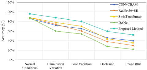 As shown in Table 3, all methods experience a decline in recognition accuracy with increasing disturbance intensity, but the proposed method shows the smallest decline, achieving an average accuracy of 87.0%, which is 4.2 percentage points higher than DANet. Under lighting change, pose variation, occlusion, and image blur, the proposed method achieves accuracies of 87.8%, 86.3%, 84.9%, and 83.7%, respectively, all significantly higher than the comparison methods. The core reasons are: the dynamic scale weight allocation mechanism adapts to feature changes under different poses and occlusions; the frequency-domain attention branch is robust to lighting changes and image blur; and the cross-modal fusion module further enhances feature anti-interference capability, ensuring high recognition accuracy in complex classroom scenarios.