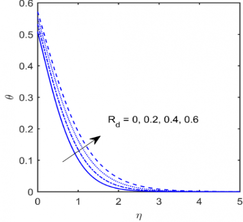 Attribute of Ec displayed in Figure 19. Here greater Ec yields higher θ(η). Larger values of Ec causes to increase resistance in fluid motion as a consequence of this much heat is produced hence temperature profile increases. Influence of Nt on θ(η) and ϕ(η) is disclosed via Figure 20 and Figure 21. Clearly a rise in Nt augments temperature and concentration. Physically, thermophoresis force increases with enhancement of Ec due to these nanoparticles are being pushed towards cold zone from hot zone and hence increase in the Nt temperature and ϕ(η) increases. Figure 22 is sketched to discuss the variation of ϕ(η) due to Nb. It is detected that ϕ(η) exhibited decreasing tendency for greater values of Nb. It is happened due the uneven movement of nanoparticles in the fluid. Figure 23 interprets the role of Rd on θ(η). From the figure it is described that larger values of radiation parameter enhance the temperature profile θ(η). Physically radiation process generates much heat in the liquid and corresponding thermal layer gets thicker.