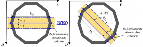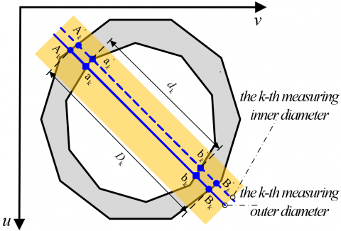 According to ISO3126:2005, the internal and external diameters of the PVC end-face are denoted as d and D, respectively; the number of detection points as 2n; the number of measured diameters as n; the coordinates of the mean center points in internal and external diameters as (uD0, vD0) and (ud0, vd0), respectively.