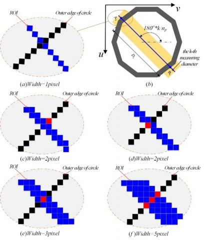 To ensure the uniqueness of the intersection, the value of a must be an odd number. As shown in Figure 4(e), when a is 3 pixels, the intersection remains stable, and reflects the end point of the measured diameter. In this case, the ROI expands with the growth of the size parameter a, and the end point of the measured diameter can be acquired with a high anti-interference ability and accuracy. Nevertheless, a=3 pixels bring a large computing load and a low computing efficiency. Through overall consideration of stability, efficiency and accuracy of feature point extraction, this paper sets a to 3 pixels.