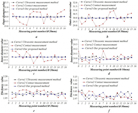 During the experiments, three-coordinate measuring machines (DAISY 564L precision: 0.0026mm) was utilized to measure each workpiece, and the measured value was approximated as the true value. The traditional ultrasonic measurement method and our method were separately introduced to measure the internal diameter, external diameter, wall thickness, and roundness of PVC. The measured results were evaluated by formulas (14)-(16). The evaluation parameters are given in Table 1. The following conclusions can be drawn: