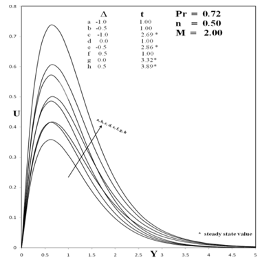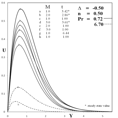 Figures 2(a), (b), (c) concerned the effects of velocity for various quantities of Pr, M, $\Delta$ and n correspondingly at a stable point X=1.0. It is viewed that the velocity profiles be drops by cumulative quantities of Pr, M, n and decreasing values of $\Delta$.