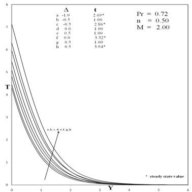 Figure 3. Temperature profiles for Various Values of Pr, M ∆ and n