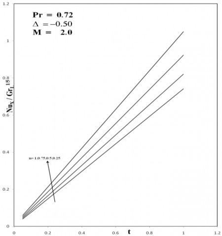 $N{{u}_{x}}=\frac{-x{{\left( \frac{\partial T'}{\partial y} \right)}_{y=0}}}{T_{w}^{'}-T_{\infty }^{'}}$ (6)