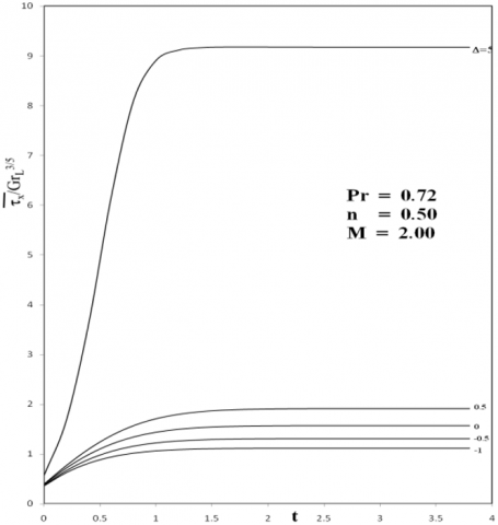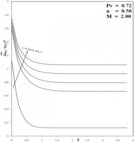 Figures 4(a), (b), (c) demonstrates the effects of shear stress coefficient for different parameters Pr, $\Delta$, M and n. It is noticed that, the decreasing values of Pr, $\Delta$, M and increasing values of n decreases the coefficient of local skin friction.