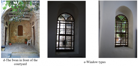 The Arar family constructed bayt Arar in 1890. Later, it was occupied by British Advisors. In 1930, it was used as a hospital. This building, located in Tel Irbid in the southwest part of this city, is a small house that consists of three adjacent rooms. The upper floor of the rooms is built of stone and clay, while its exterior is constructed from black stone, and its roof is made from clay supported by metal bridges. Only one room was left and used by a craftsman [15]. The main entrance, the courtyard, wooden ceiling, and window types of this house are shown in (Figure 11. a, b, c, d, and e) respectively.